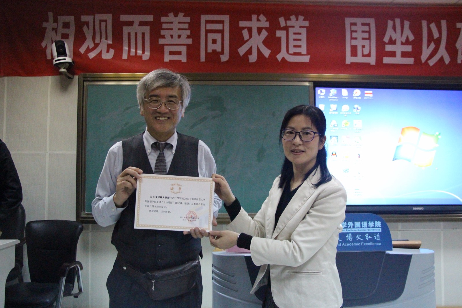 讲座最后,徐微洁老师代表学院再次感谢矢泽教授不远千里来外院为师生们带来学术大餐,并为矢泽教授颁发了讲座证书。矢泽教授也给日语系赠送了一套自己参编的丛书和一本原版辞典,并表示会尽自己最大的努力促进我校和筑波大学之间的学术交流与师生交流。