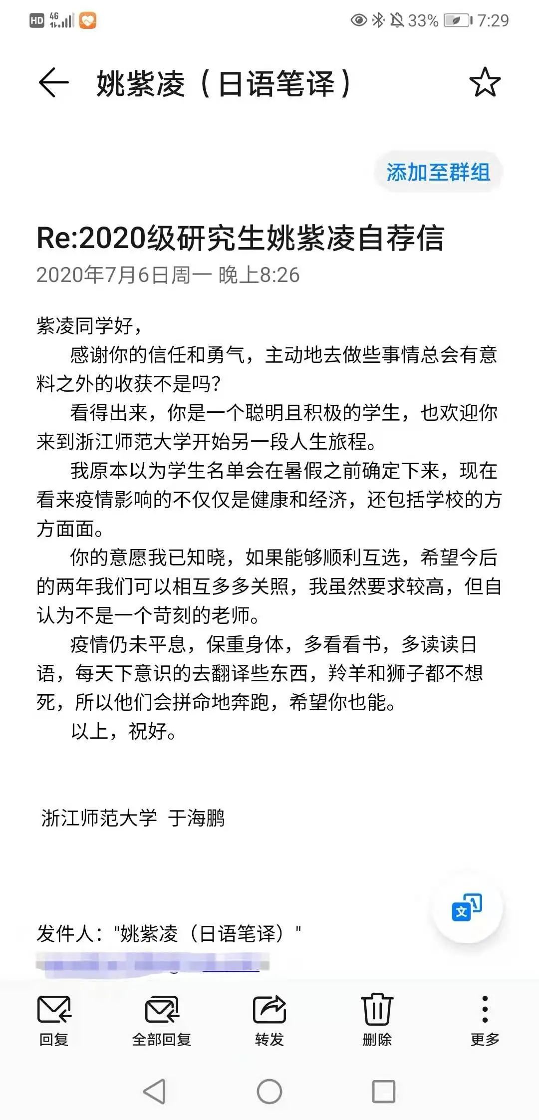 《师说》有云:“古之学者必有师。师者,所以传道授业解惑也。”人活一世,师者无数,若能遇到一位在关键的几步给予自己指点的良师可谓是三生有幸。幸好,在这里,在浙江师范大学外国语学院,在我的人生从懵懂逐渐成熟的研究生生涯中我遇到了这样一位老师,一位亲切、温暖、严谨、活泼的导师——于海鹏。
