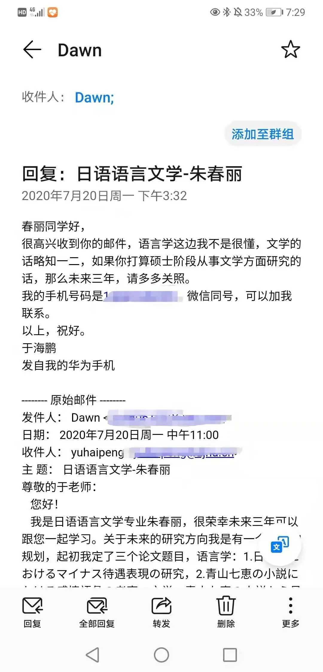开学前夕,我通过邮件的方式和于老师取得了联系。怀着忐忑不安的心情,我对邮件的内容字斟句酌,点下发送键后,便惴惴不安地等待着。很快,回信翩然而至,刚一看到开头于老师亲切的称呼“丫头”,我的忐忑便消失了大半。邮件里,于老师列出的任务清单和必读书目让我的假期生活变得充实,老师的鼓励和指点也让我对即将启程的研究生生活充满了期待。