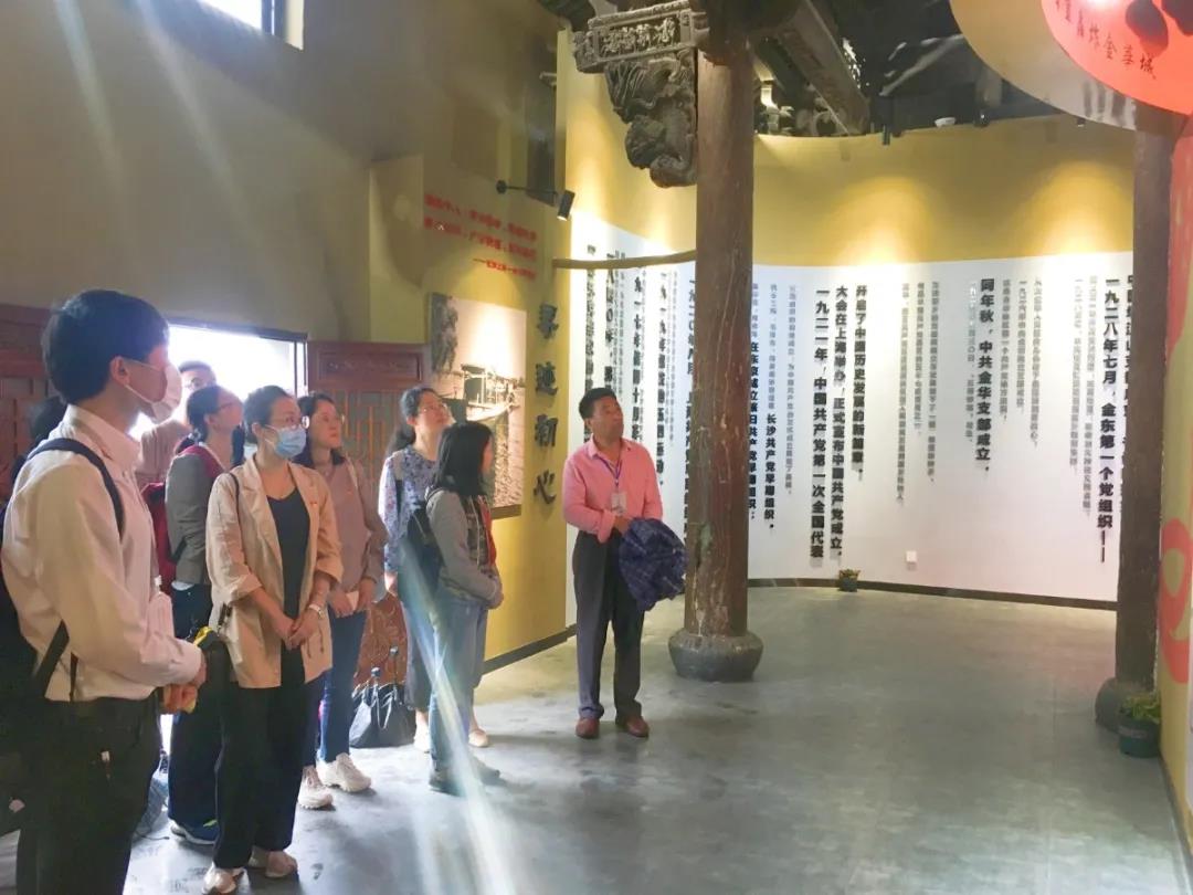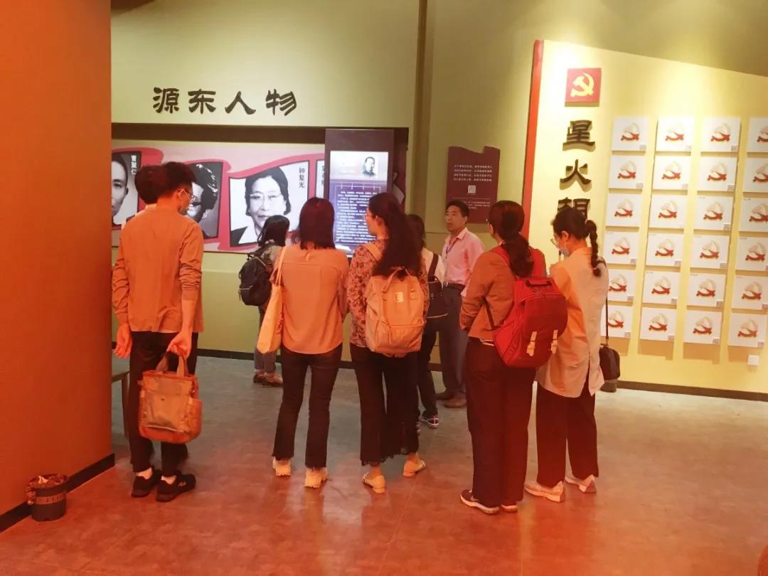 最后,日语系教师党支部来到位于源东乡长塘徐村的源东红馆。抗战时期,在源东乡长塘徐一带有一支党领导的抗日武装,这就是金萧支队第八大队第三中队。八大队三中队在源东、曹宅和孝顺等地战斗7年,粉碎了日伪扫荡和国民党顽固派进攻,巩固扩大了金义浦抗日根据地,取得了辉煌战果。这里曾发生了两场有名的战役,分别是长塘徐伏击战和两头塘狙击战。英名长存,火种不灭,2020年初,金东区文旅局与源东乡以“不忘初心、牢记使命”为主题,在长塘徐村打造“源东红馆”。场馆总面积245平方米,分为序厅、寻迹初心、烽火源东、源东人物、星火相传等5大板块,集中展示了金萧支队第八大队在源东一带的抗战历程。长塘徐村的村党支部书记徐作遗介绍说,源东红馆是源东乡第一个党支部成立的地点,改建成红馆后,除了展示馆藏资料外,还结合智慧旅游系统,将当年第一个党支部的成员生平介绍通过二维码形式上墙展示。
