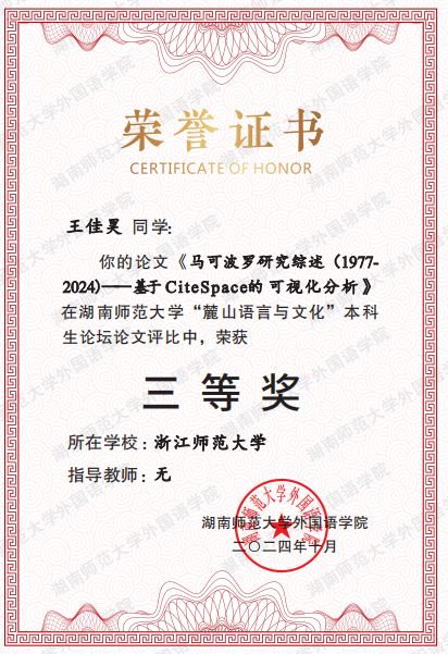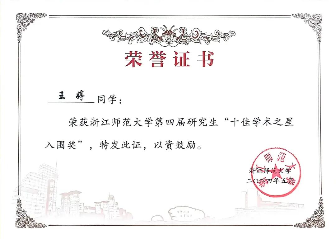 23日 2022级日语语言文学方向硕士研究生王婷获浙江师范大学第四届研究生“十佳学术之星入围奖”。(指导教师:金稀玉)