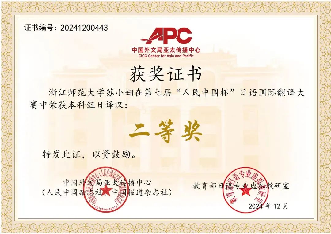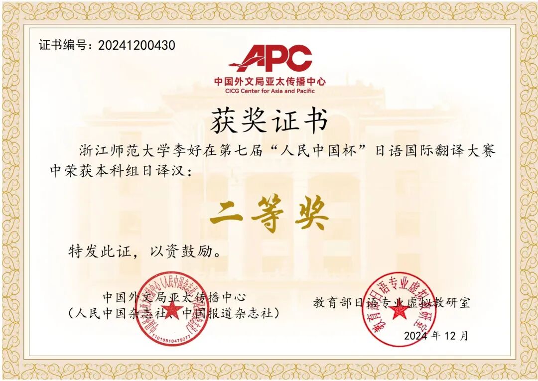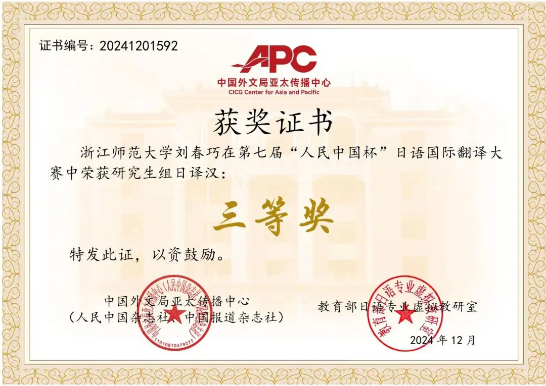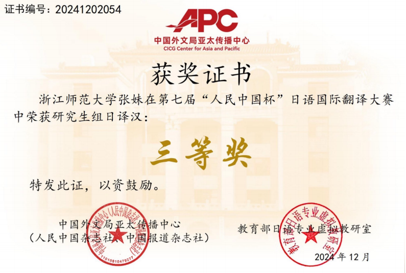13日 在2024年第三届“CATTI杯”全国翻译大赛中,日语系初赛阶段共有18人次获奖,复赛阶段10人次获奖,决赛阶段2023级日语笔译方向硕士研究生杜海榕同学荣获三等奖。(指导教师:徐微洁、金稀玉、金玉英)