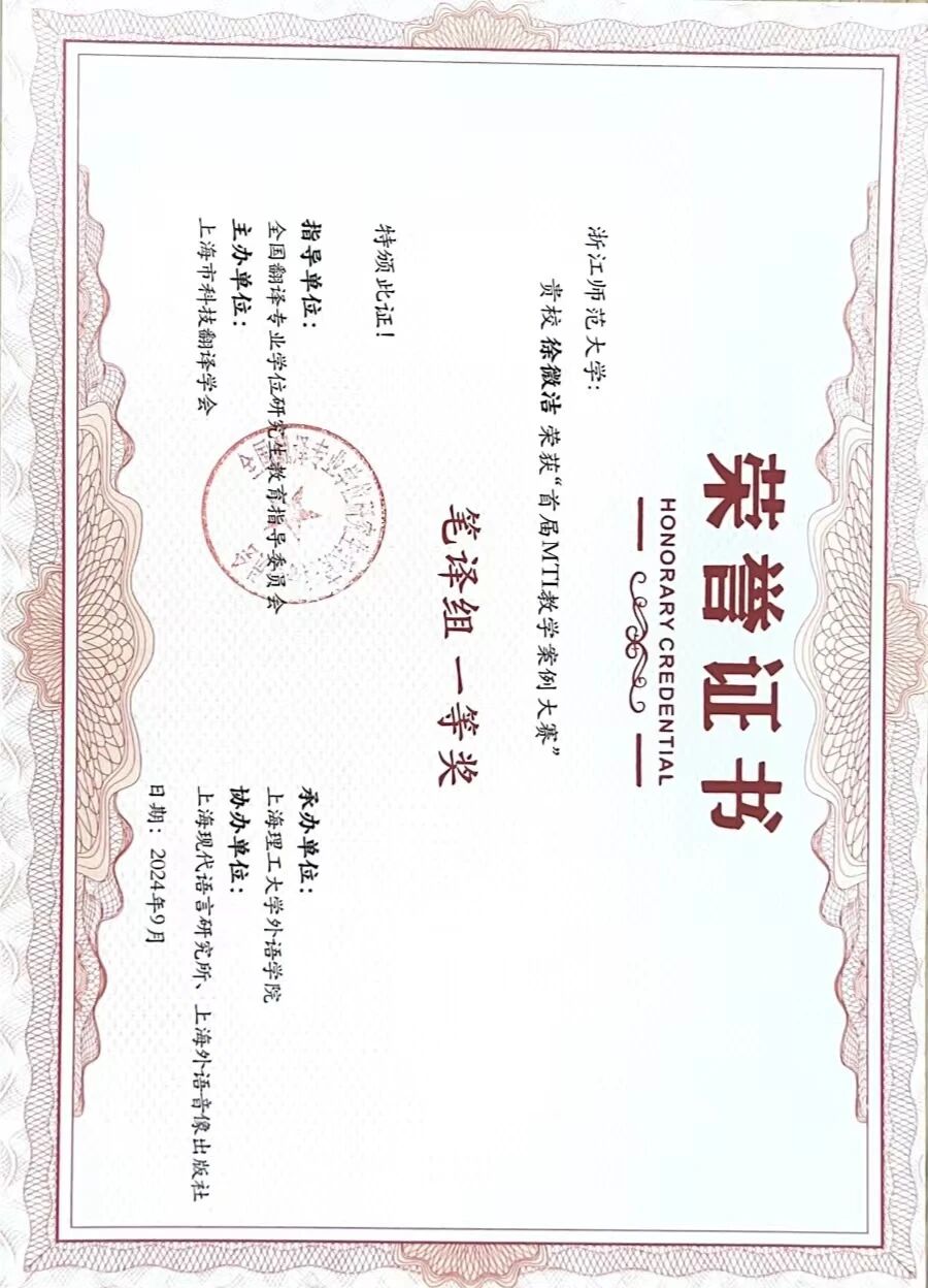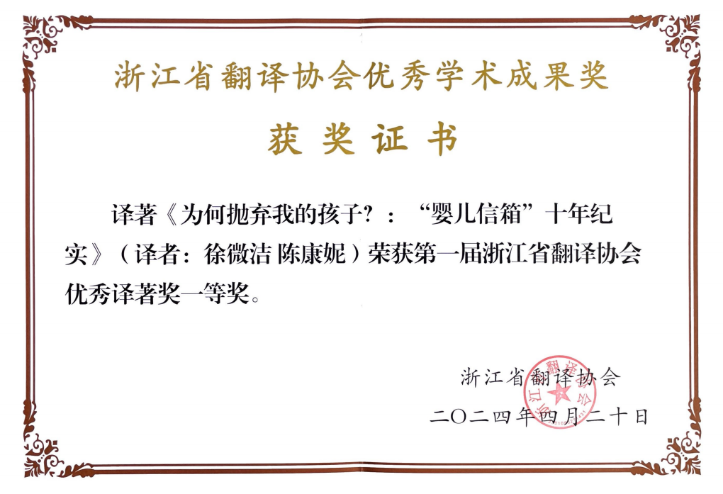 20日 金稀玉副教授参加2024年浙江省翻译协会年会暨“翻译与中国式现代化”学术研讨会,徐微洁教授获第一届浙江省翻译协会优秀译著奖一等奖,金稀玉副教授获第一届浙江省翻译协会优秀论文奖三等奖。