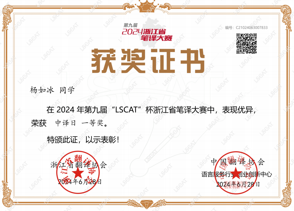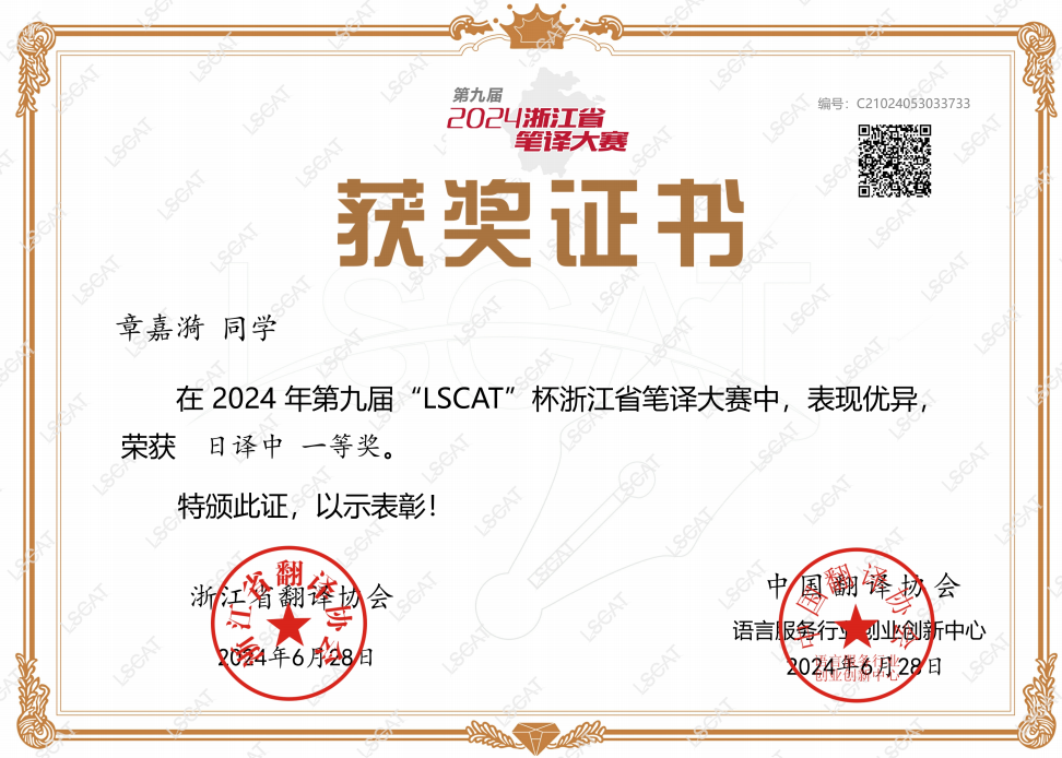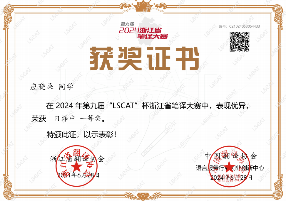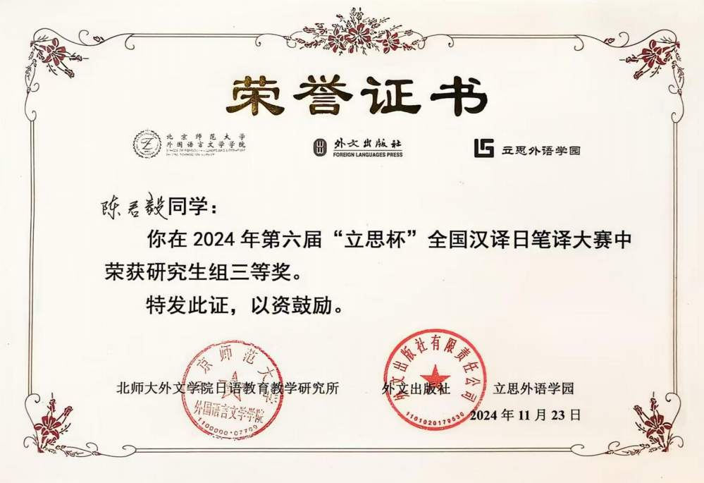 23日 2023级日语笔译方向硕士研究生陈君毅、2024级日语笔译方向硕士研究生兰梦婷获第六届“立思杯”全国汉译日笔译大赛研究生组三等奖。(指导教师:徐微洁)