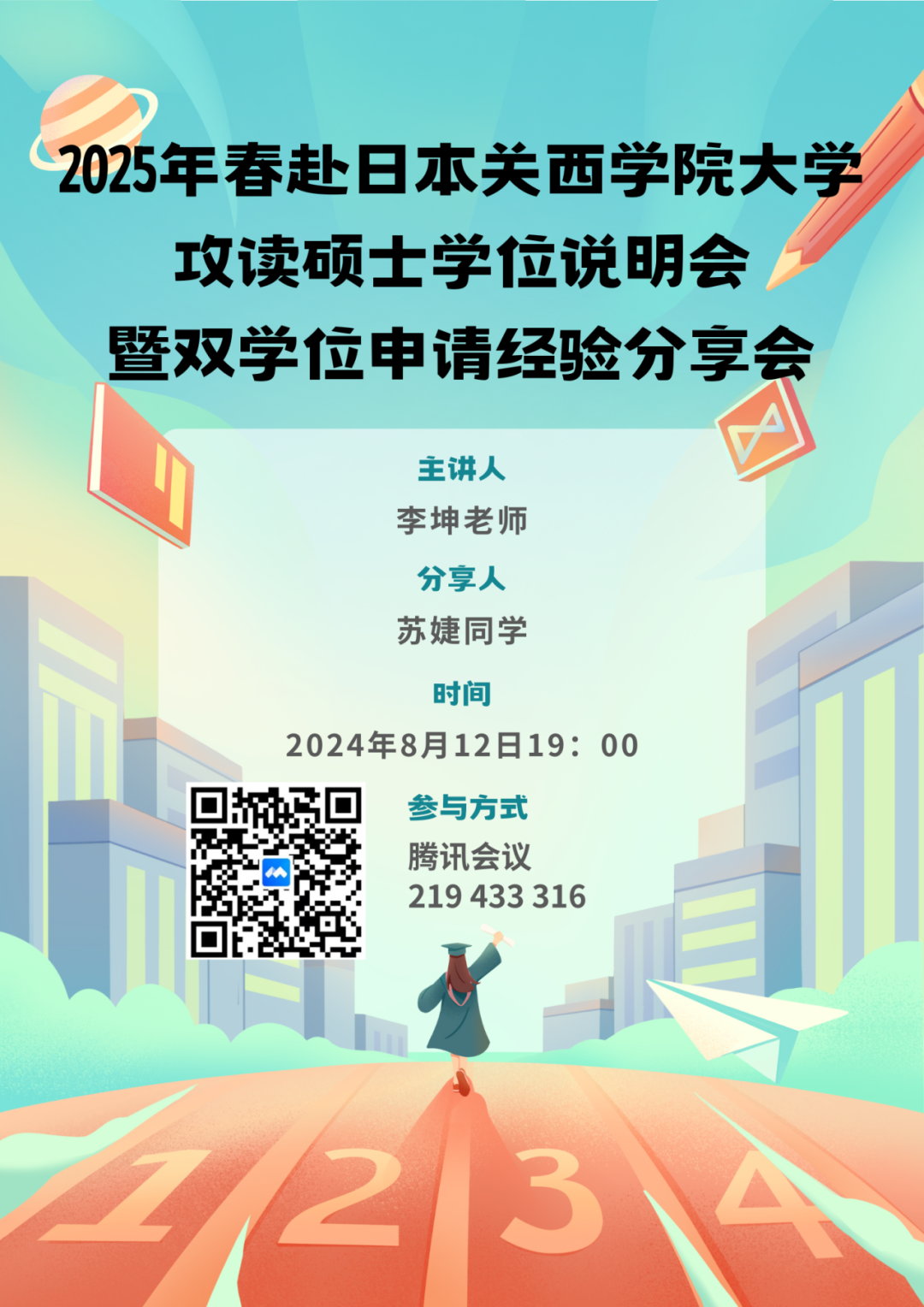 12日 日语系举行2025年春赴日本关西学院大学攻读硕士学位说明会暨双学位申请经验分享会,教研室主任李坤博士对该项目进行了介绍、2023级日语语言文学方向硕士研究生苏婕同学进行了分享。