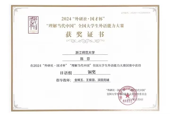 9日 日语系212班学生陈芬获第二届“外研社·国才杯” “理解当代中国”浙江省大学生外语能力大赛日语组银奖、全国大学生外语能力大赛国赛日语组铜奖,212班学生陈安娜获省赛铜奖。(指导教师:金稀玉、王紫薇、滨田亮辅)