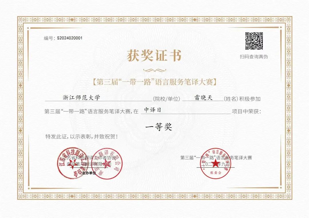 16日 在第三十六届韩素音国际翻译大赛中,日语系2021级学生宁乐获日译汉二等奖、2023级日语语言文学方向硕士研究生应晓朵获日译汉优秀奖,我校获最佳组织奖。