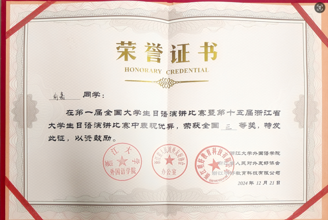 21日 日语系231班学生俞嘉获“第一届全国大学生日语演讲比赛暨第十五届浙江省大学生日语演讲比赛”全国三等奖、省级二等奖。(指导教师:倪乐飞、鱼澄真穗)