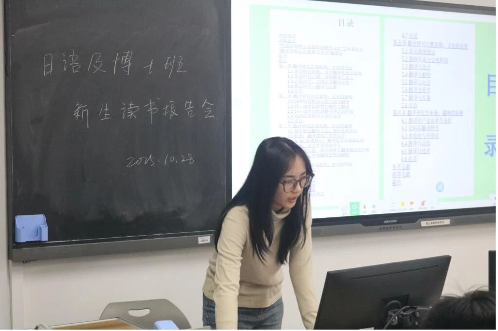 2025年10月28日晚上,日语系2025级研究生读书报告会日语语言文学、日语笔译与博士专场于22幢326教室举行。来自日语语言文学专业、日语笔译专业以及外国语言文学一级学科博士点的31名同学逐一分享了自己的阅读心得与体会。我系包央老师与倪乐飞老师担任本场读书报告会评委,章莹佳同学担任主持人。