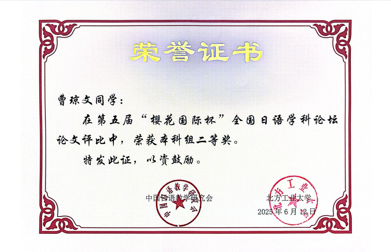 近日,第五届“樱花国际杯”全国日语学科论坛论文评比圆满落幕。日语系学子斩获二等奖2项。其中,日语语言文学方向研究生林柳君获研究生组二等奖;日语专业本科生曹琼文获本科组二等奖。