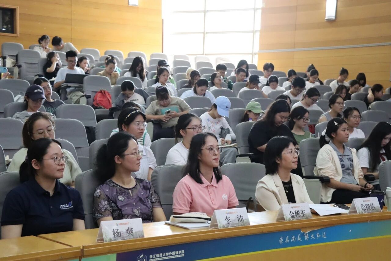 2025年10月25日下午,全日空航空公司杭州办事处支店长高桥贤治一行应邀到访浙师大外国语学院日语系,并为日语系师生带来了一场精彩的商务礼仪专题讲座。学院副院长徐微洁、日语系主任金稀玉、日语系教师李沛出席本次活动。讲座由日语系教研室主任李坤主持。