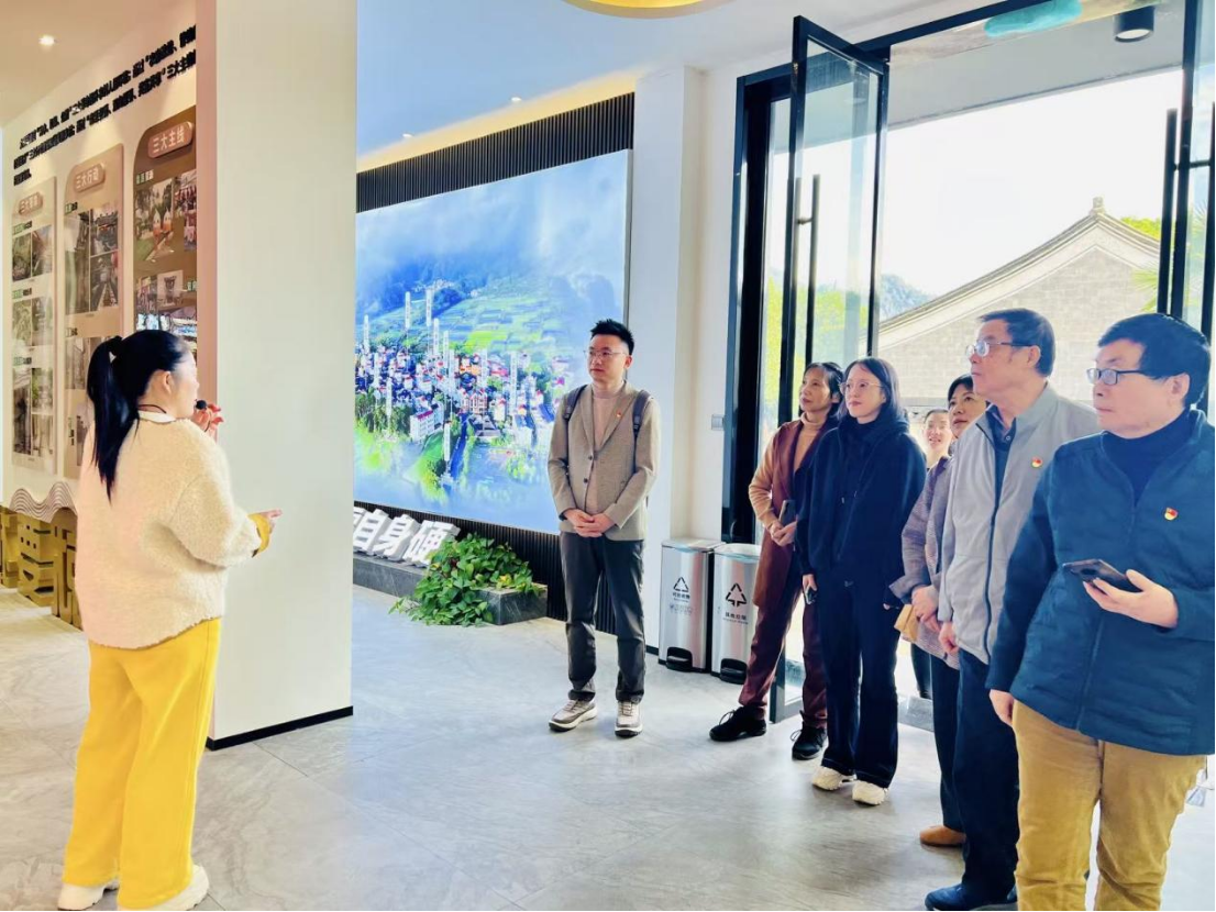 大陈村党群服务中心是村党组织服务群众、宣传政策、推动治理的“前沿阵地”,设有党建展厅、群众议事厅、村情数据大屏、多功能活动室等多个区域,硬件设施完善,功能布局科学。大陈村旅游部负责人金丽珍接待了同志们一行,并安排义务讲解员陈梅菊全程负责讲解。同志们在陈梅菊的详细介绍下,深入了解了中心的设计理念与功能设置,认真参观了“千万工程”主题展板区。展板上依时序展示了大陈村近二十年在“产业强、环境美、村民富”目标引领下取得的主要成果:从村容整治到生态提升,从集体经济壮大到村民收入倍增,从人居环境整治到文化空间优化,每一张照片、每一组对比数据都见证了“党建+治理”模式在基层落地生根。